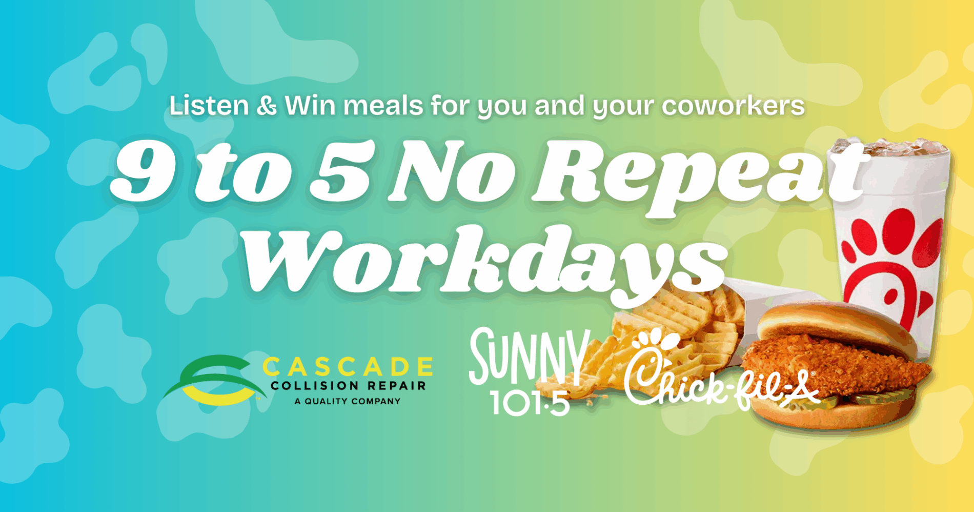 Listen while you work to win 10 Chick-Fil-A meal deals during the Cascade Collision 9 to 5 No Repeat Workday on Sunny 101.5.